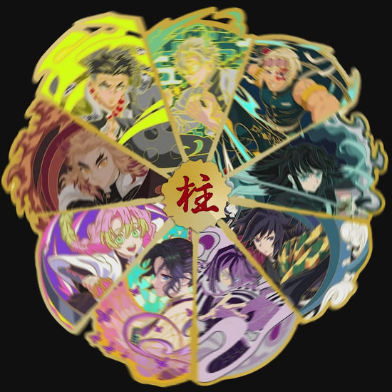 Elevate your collection with this limited-edition spinning glow-in-the-dark enamel pin featuring all nine legendary Hashiras of the Demon Slayer Corps. Each pin is expertly crafted with premium hard enamel, durable metal plating, and a smooth spinning mechanism that brings every Pillar’s unique technique to life in motion.