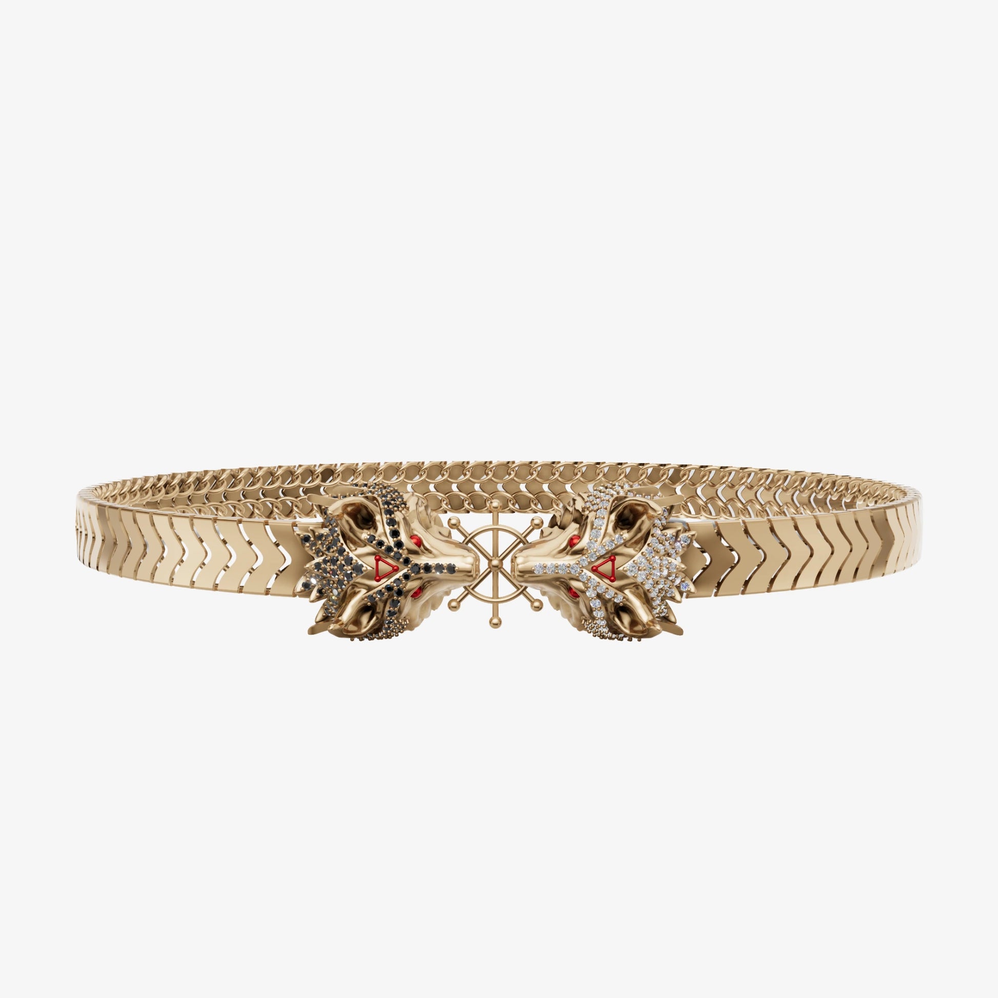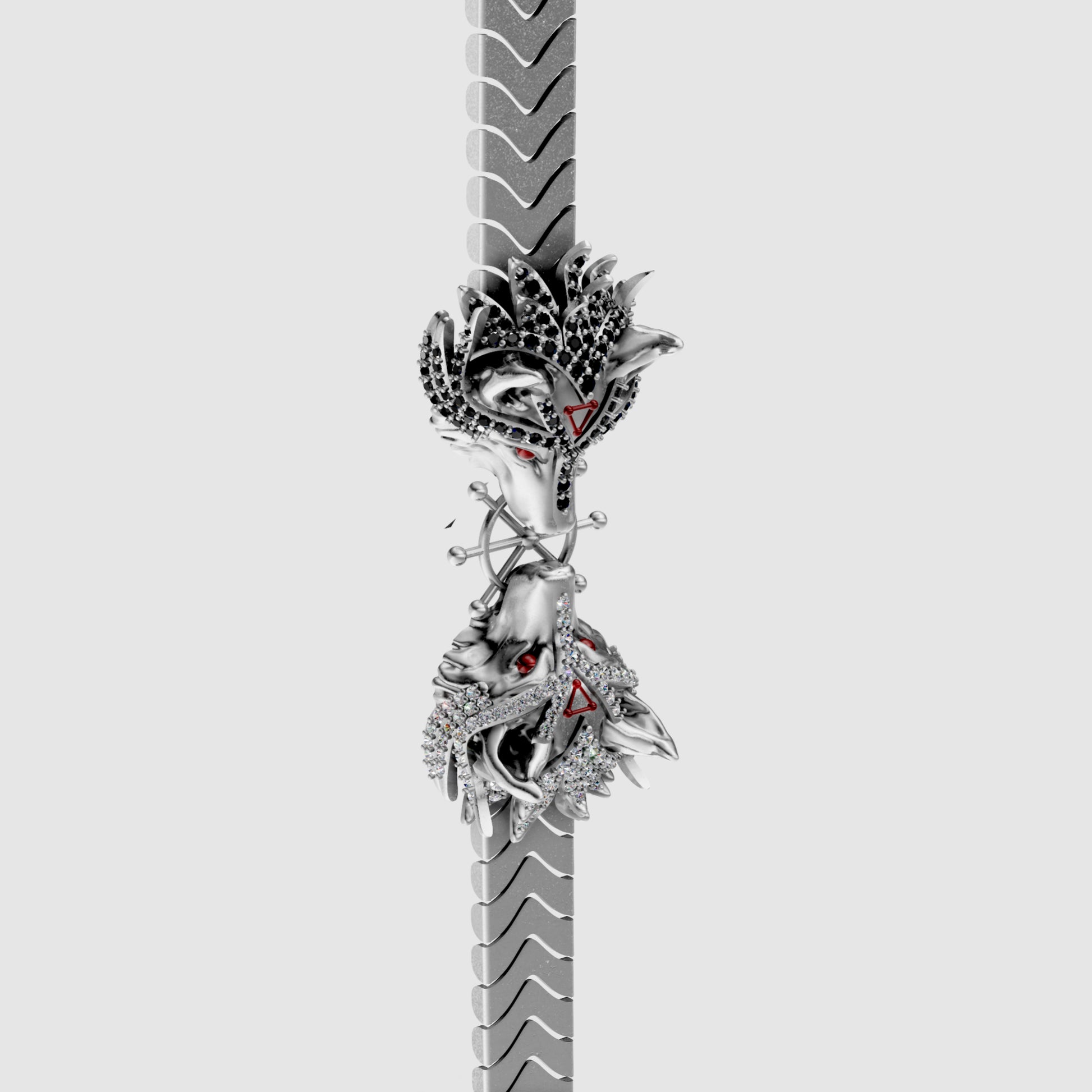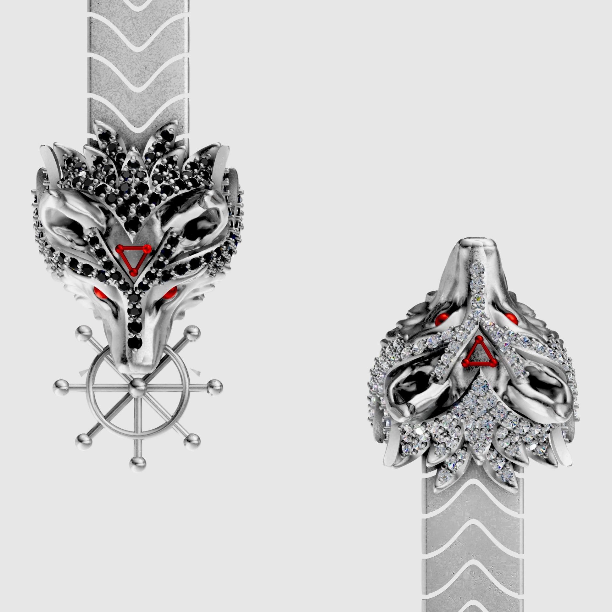 ✓ His two hand-sculpted Divine Dogs at the center, one covered in sparkling black zircon and the other in bright white zircon, featuring sharp red eyes and signature red triangle symbols.