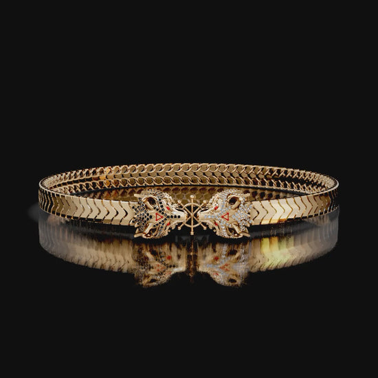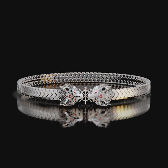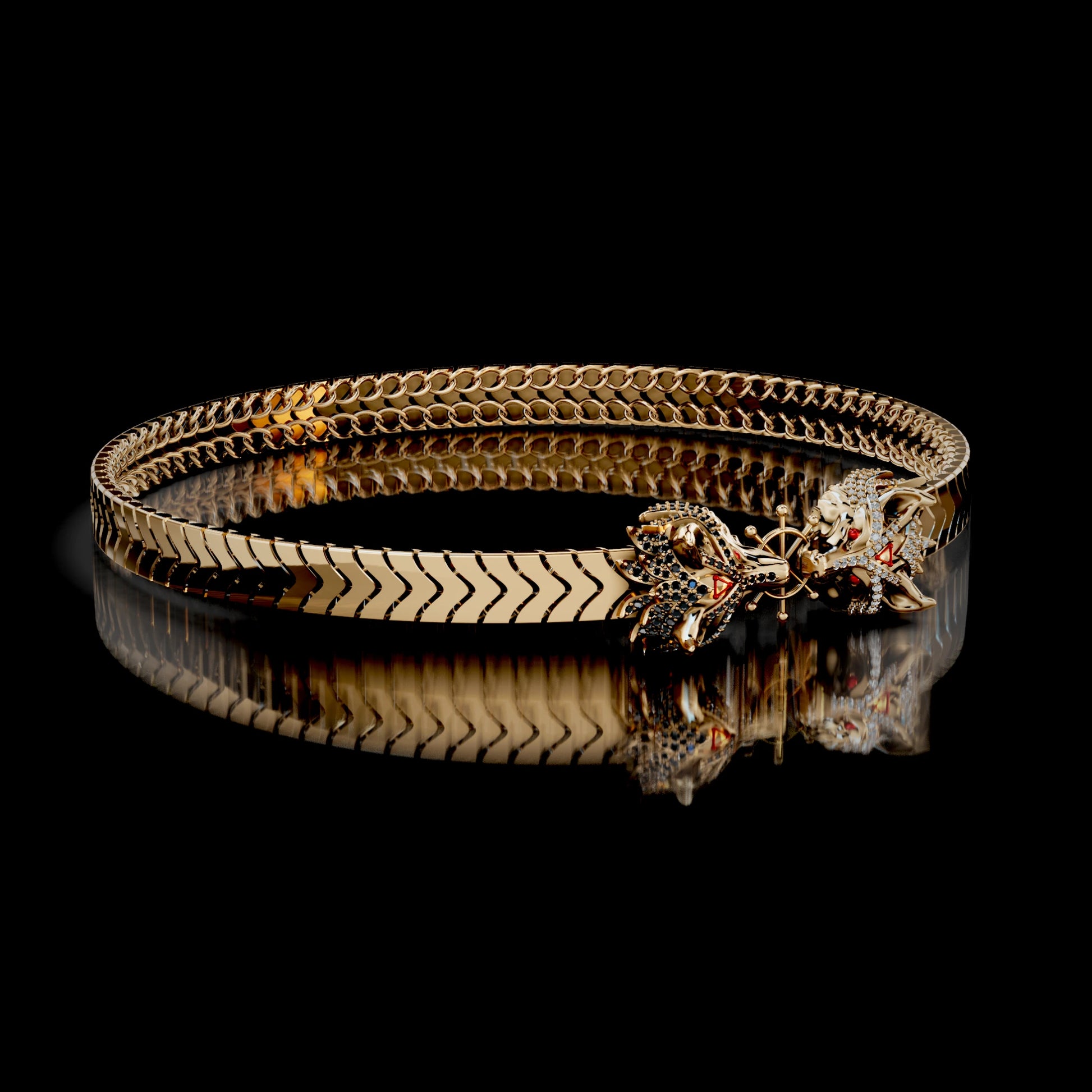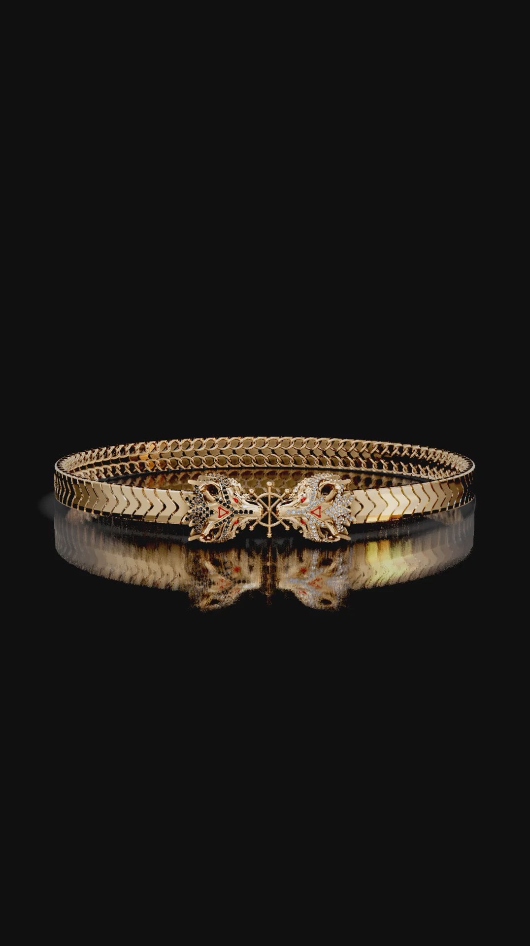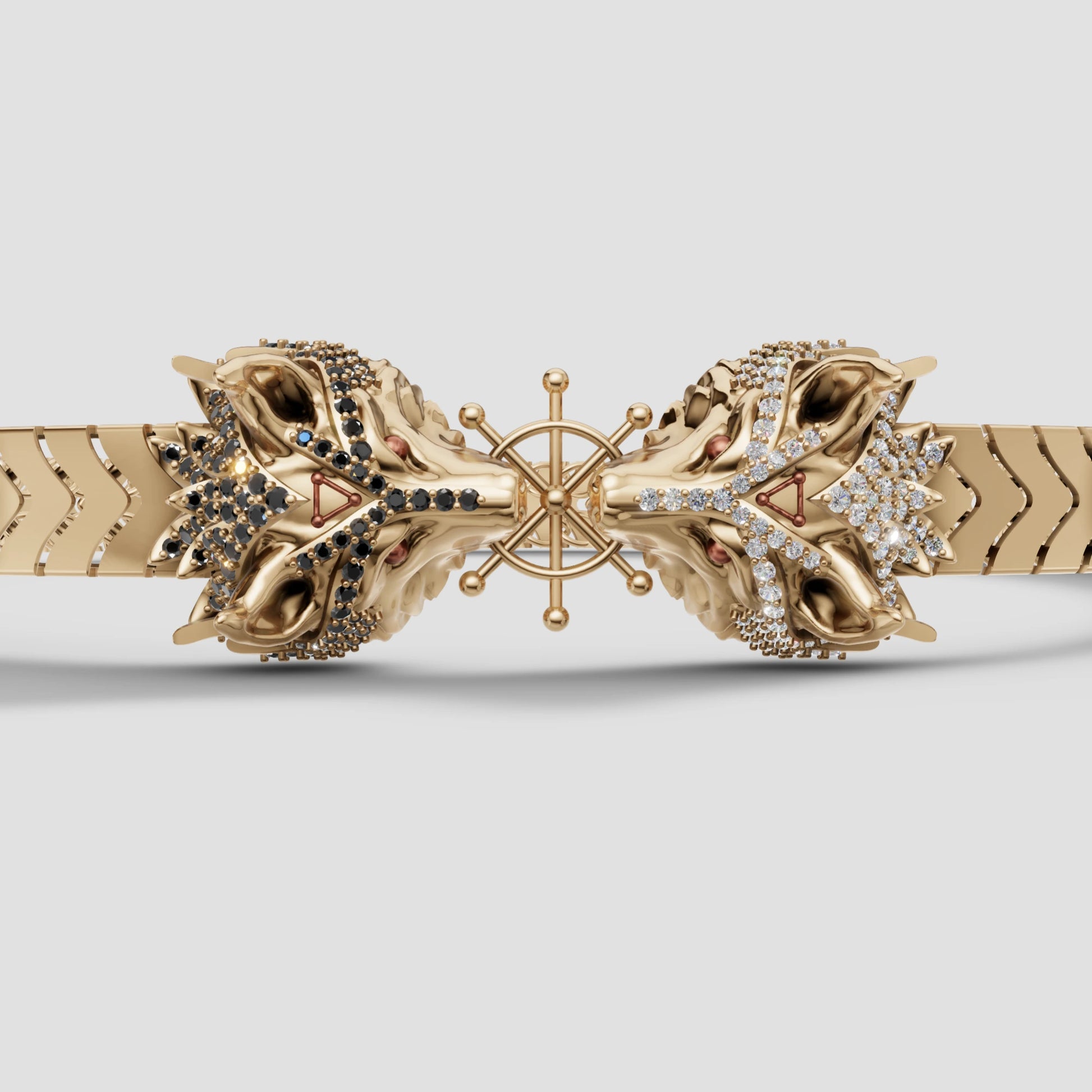 ✓ His two hand-sculpted Divine Dogs at the center, one covered in sparkling black zircon and the other in bright white zircon, featuring sharp red eyes and signature red triangle symbols.